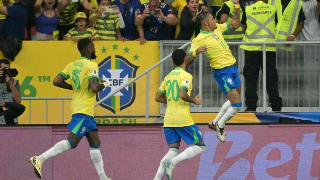 O técnico Dorival Júnior alinhou a Seleção Brasileira com: Ederson; Danilo, Marquinhos, Gabriel Magalhães e Abner; Bruno Guimarães e Gerson; Savinho, Raphinha e Vinicius Jr; Igor Jesus.