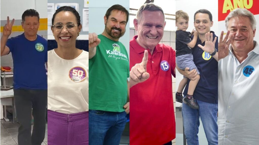 Candidatos à Prefeitura de Vitória, Assumção (PL), Camila Valadão (PSOL), Du (Avante), João Coser (PT), Lorenzo Pazolini (Republicanos) e Luiz Paulo Vellozo Lucas (PSDB), votam na manhã de domingo no Espírito Santo — Foto: Divulgação