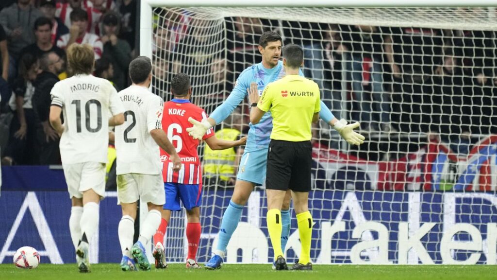 Após o gol marcado por Éder Militão que abriu o marcador para o Real Madrid, os ultras da torcida do Atlético de Madrid atirou diversos objetos em direção ao gramado no gol que estava o goleiro belga Thibaut Courtois.