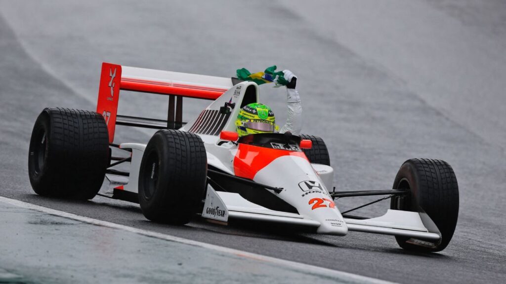 O inglês esteve à frente da McLaren MP4/5B, icônico carro de Senna de 1990, ano no qual o piloto brasileiro conquistou seu segundo título mundial da categoria. Hamilton, inclusive, repetiu o gesto do astro ao segurar uma bandeira do Brasil com uma das mãos.