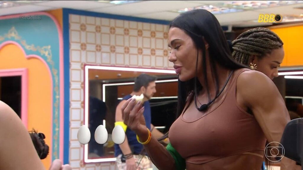 FOCADA! A musa fitness Gracyanne Barbosa, que entrou em dupla com a irmã Giovanna, acabou de entrar na casa do BBB 25,mas já comeu nove ovos cozidos na tarde desta segunda-feira (13). A edição do programa fez uma brincadeira e contabilizou os ovos comidos.