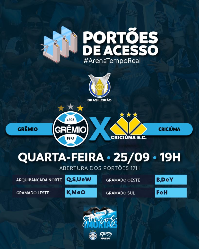 O confronto entre Grêmio e Criciúma, válido pelo Brasileirão 2024, acontecerá nesta quarta-feira, 25 de setembro, às 19h. Todas as rampas de acesso à Arena do Grêmio estarão abertas.