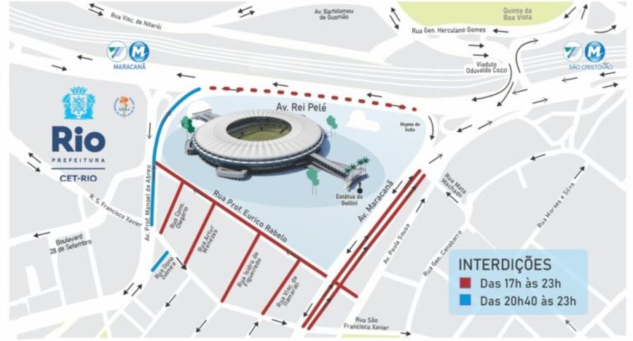Evite ir de carro ao Maracanã e dê preferência ao transporte público. É recomendado aos motoristas que evitem passar pela região, procurando antecipar o horário de seus deslocamentos ou utilizar as rotas alternativas. Diversas vias no entorno do estádio serão interditadas: