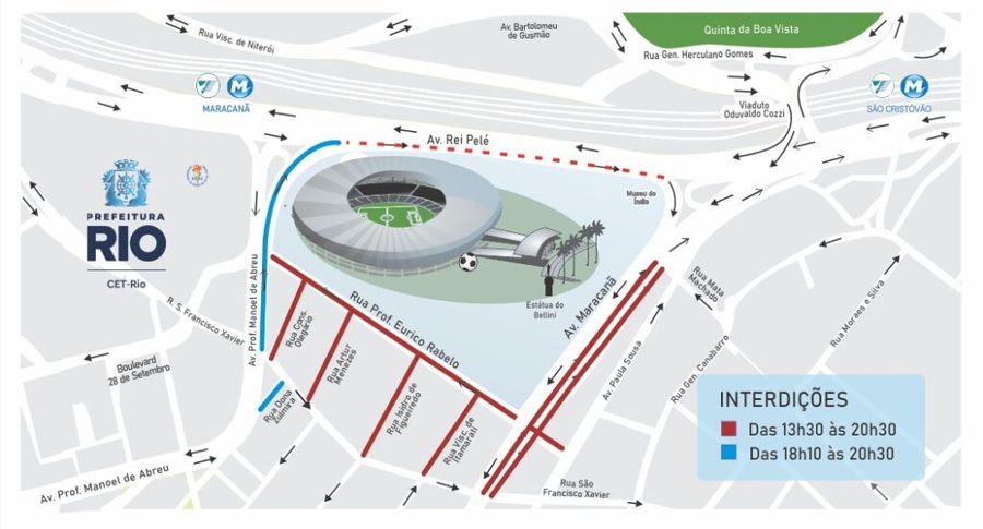 Evite ir de carro ao Maracanã e dê preferência ao transporte público. É recomendado aos motoristas que evitem passar pela região, procurando antecipar o horário de seus deslocamentos ou utilizar as rotas alternativas. Diversas vias no entorno do estádio serão interditadas:
