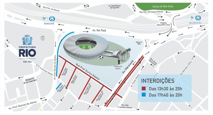 Evite ir de carro ao Maracanã e dê preferência ao transporte público. É recomendado aos motoristas que evitem passar pela região, procurando antecipar o horário de seus deslocamentos ou utilizar as rotas alternativas. Diversas vias no entorno do estádio serão interditadas:
