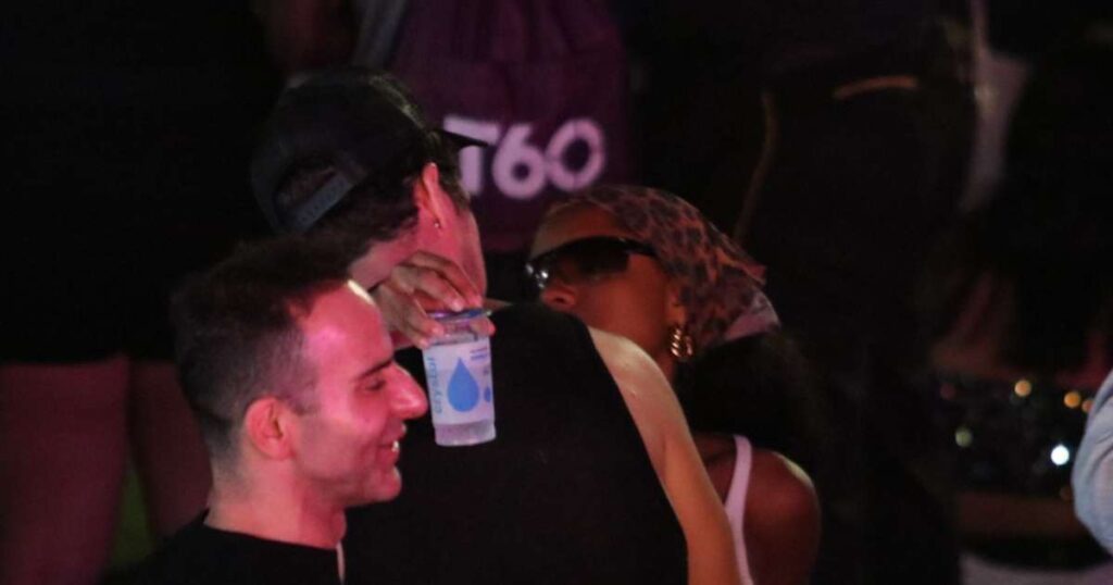 No festival, a moça usava um lenço com estampa animal print na cabeça e óculos escuros. José Loreto, por sua vez, estava com um look monocromático na cor preta, ou seja, calça, camiseta, pulseira e boné, all black.