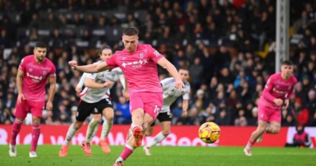 Foto: Justin Setterfield/Getty Images – Legenda: Delap cobra o pênalti que gera o segundo gol do Ipswich. Contudo, o Fulham conseguiria arrancar o 2 a 2 no fim / Jogada10