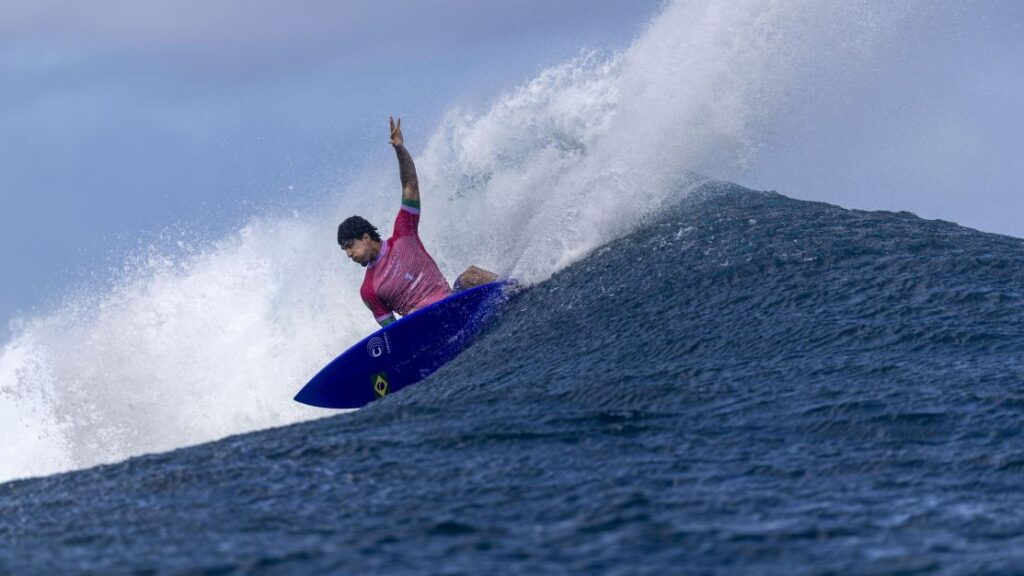 Gabriel Medina fez bateria espetacular e garantiu vaga nas quartas de final do surfe na Olimpíada de Paris Crédito: Sean M. Haffey/Getty Images
