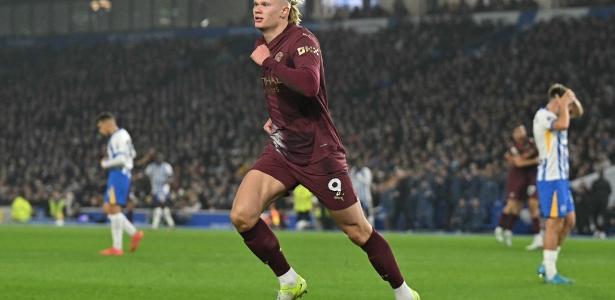 Haaland comemora gol do Manchester City pelo Campeonato Inglês Imagem: GLYN KIRK/AFP