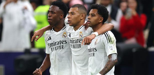 Vini Jr, Mbappé e Rodrygo comemoram gol do Real Madrid contra o Pachuca, na final do Intercontinental Imagem: Christopher Pike/Getty