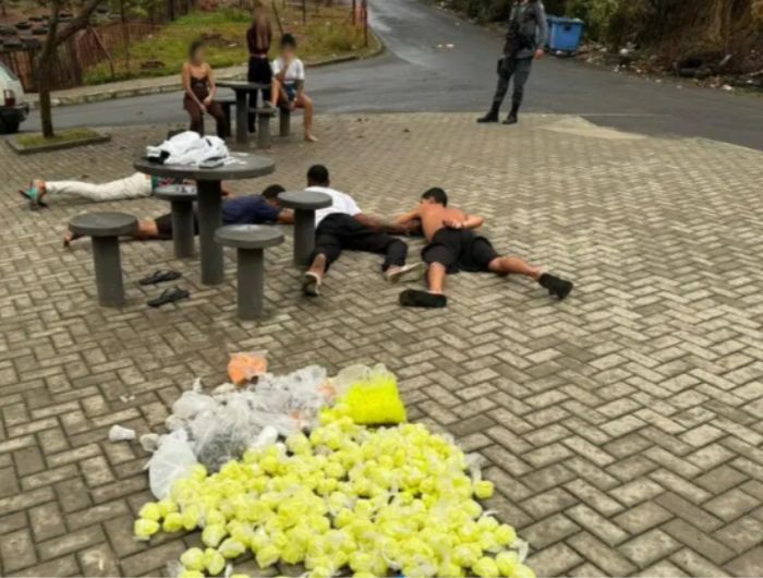 O cerco foi rápido. Três tentaram escapar pulando o muro, mas foram alcançados ainda no quintal vizinho. Dentro do imóvel, a cena confirmava o flagrante: sacolas com pinos de cocaína prontos para a venda, microtubos vazios para abastecer a biqueira, dinheiro miúdo e celulares. Ao todo, foram apreendidos 6.721 pinos da droga, quatro aparelhos e R$ 50 em espécie.