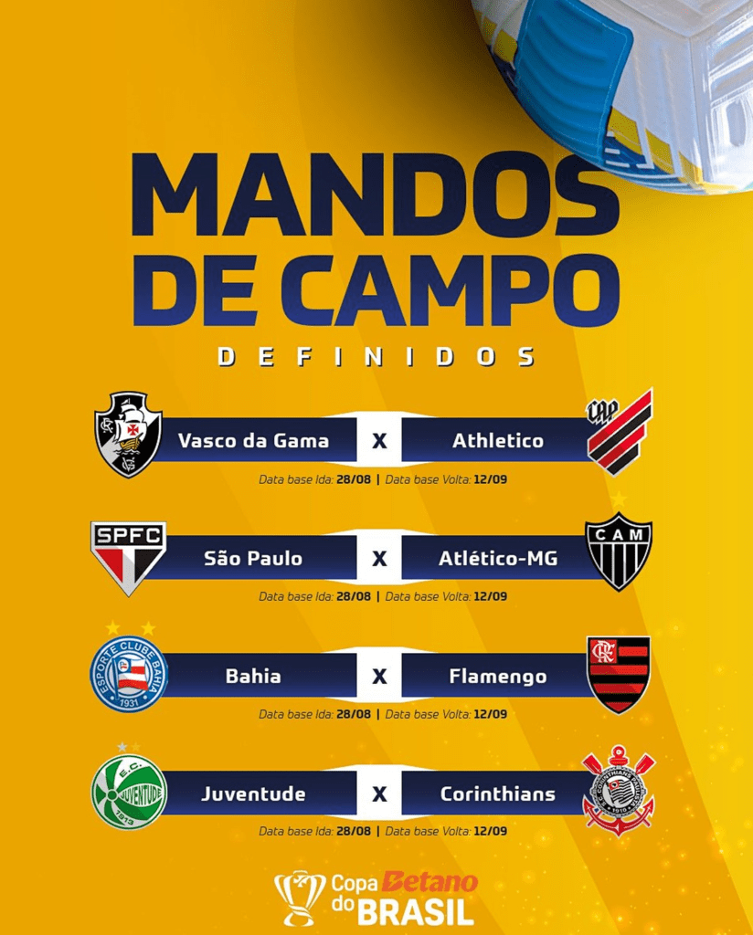 Athletico, Flamengo, Atlético-MG e Corinthians decidem em casa os confrontos contra Vasco, Bahia, São Paulo e Juventude, respectivamente.
